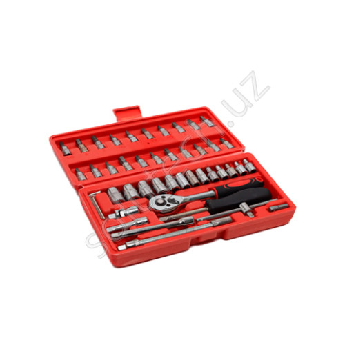 Набор состоит из 46 деталей, включая головки из хромованадиевой стали диаметром от 4 до 14 мм.