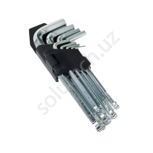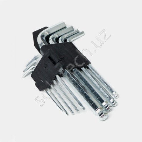 Набор инструментов для автомобиля - Г-образных шестигранников (имбусовых ключей). Материал изготовления входящих в состав набора шестигранников - прочная и долговечная хромованадиевая инструментальная сталь, обработанная до твердости 39-41 HRC; наличие матирующего хромоникелевого покрытия обеспечивает надежную защиту входящих в состав набора ключей от коррозии. В комплект также входит удобный и компактный пластиковый холдер, обеспечивающий удобство хранения и перемещения этих угловых ключей. В комплекте представлены удлиненные шестигранники размерами 1.5, 2, 2.5, 3, 4, 5, 6, 8, 10 мм. Форм-фактор шестигранника - его г-образные очертания - обеспечивает максимально возможный крутящий момент; расположение плечей ключа друг относительно друга и их разная длина делают возможным проведение работ в том числе в труднодоступных местах.